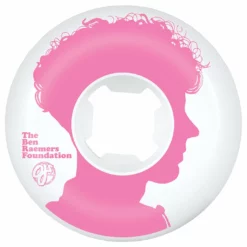 OJ Wheels X Ben Raemers Foundation 54mm EZ Edge wheels featuring Queen Maaaaate! and Ben silhouette graphics on white 99a high performance urethane.