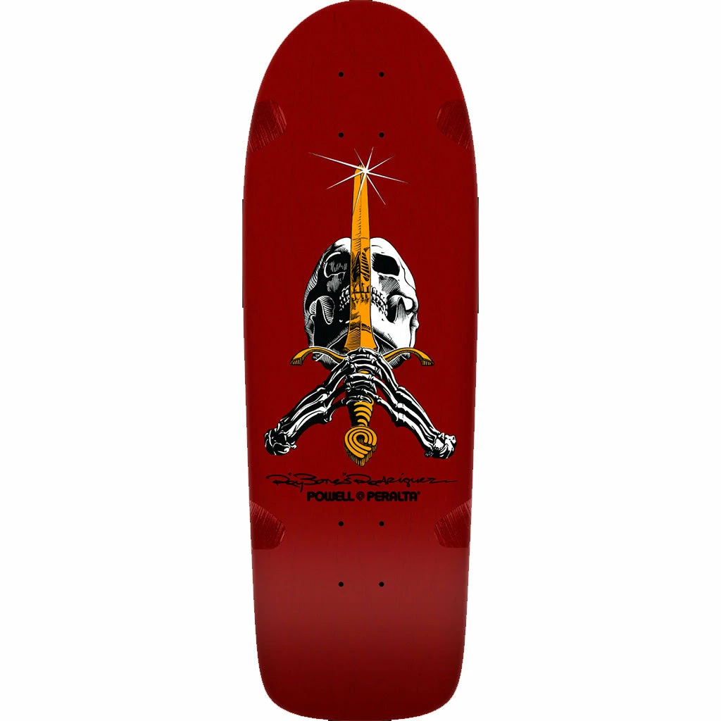 The Rodriguez “Skull & Sword” deck was the first pro signature deck graphic produced by Powell-Peralta. The graphic was conceived by Ray and Illustrated by V.C. Johnson with art direction from George Powell in 1979.